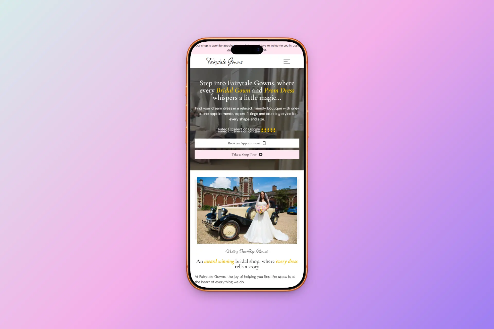 A beautifully crafted website experience for Fairytale Gowns, reflecting the elegance and personal service of their boutique.